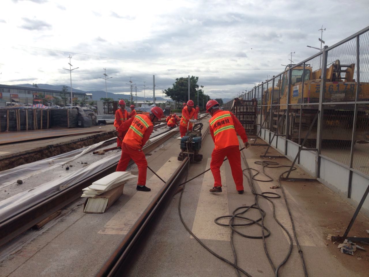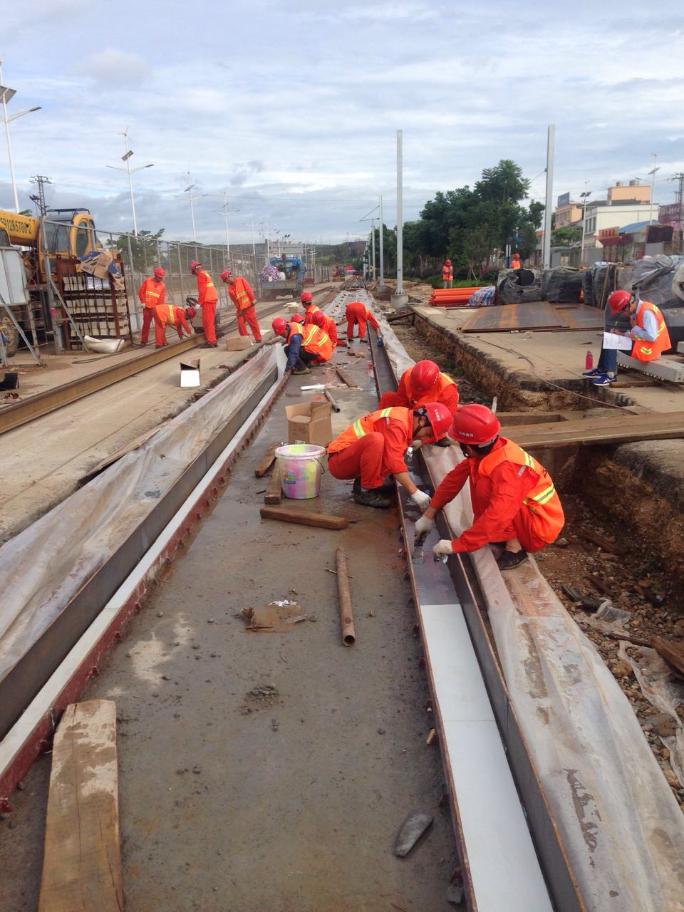 ? ? ? ? 供貨合同確定以后,軌道工程公司領(lǐng)導(dǎo)迅速組織技術(shù)、質(zhì)量、供應(yīng)、工程等相關(guān)部門就線路應(yīng)用方案進(jìn)行專題研究,人、機(jī)、料、法、測全部準(zhǔn)備到位,2016年7月1日開始配合安裝公司進(jìn)行安裝。截止到7月12日上午,雨過鋪左、右線各100米嵌入式軌道系統(tǒng)鋼制承軌槽已全部安裝完畢,目前正在通過監(jiān)理驗收。同時,已順利完成高分子A、B料的取樣工作,并開始右線混凝土澆筑。