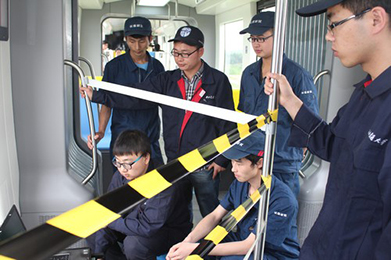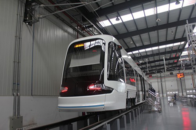 由新筑股份公司和中國北車長春軌道客車股份有限公司共同合資打造的軌道交通裝備生產基地位于成都天府新區。走進生產基地,寬敞的廠區道路旁坐落著一排排嶄新的車間,分別是現代有軌電車的總裝總調車間、車體和轉向架制造車間與表面處理車間。經過車間,來到生產基地后方的動態調試線,一輛外型時髦美觀的現代有軌電車正在線上進行調試。這輛用于新津本地R1項目的現代有軌電車車輛于一個月以前已裝配完畢并順利通過靜態調試,廠區內的動態調試線也全面建成。該動態調試線全程1.2公里,模擬了城區路面、城郊公路、綠化帶線路等多種現代有軌電車行駛路段,可用于檢測現代有軌電車、地鐵車輛、城際動車等各類軌道交通工具在行駛過程中的安全性能、舒適度、噪聲控制、平穩度等參數。