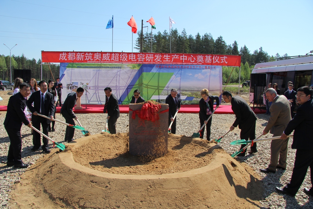 ? ? ? ?最后,白俄羅斯經濟部副部長雅羅申科、明斯克市副市長讓娜女士、四川省發改委主任唐利民、中國駐白俄羅斯使館經商參處參贊劉雪松、招商局董事、中白合資公司CEO胡政、中白合資公司總經理李海欣、成都新筑公司副總裁杜曉峰、明斯克市政機車廠總經理卡爾等為成都新筑奧威超級電容研發生產中心進行奠基培土。