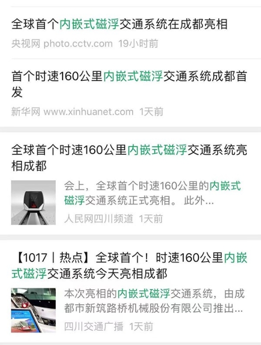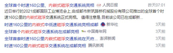 本次展會,中央廣播電視總臺(以下簡稱央視)、中新網客戶端、中新網微博、中新社官方微博等媒體通過直播,邀請公司總工程師簡煉為網友解讀系統的工作原理、技術特點、應用場景、技術優勢等;央視、中國交通頻道、四川電視臺、成都電視臺通過多個頻道多個欄目以視頻新聞的方式展開傳播報道;四川新聞頻率、四川交通廣播在多個時段播報相關新聞;人民網、新華社、光明網、中新網、今日頭條及其他媒體以圖文、視頻、新媒體展開傳播報道。公司推出的“全球首個160公里內嵌式磁浮交通系統”成為新聞熱門話題,由微博官方賬號“愛看頭條”主持的#首個內嵌式磁浮交通系統亮相成都#閱讀量達152.3萬;多個媒體官方抖音賬號發布了相關內容,熱度超過240萬,登上同城榜熱搜;截至目前百度檢索結果顯示,圍繞“內嵌式磁浮交通系統”的直接新聞報道超過150篇次,搜索結果前20頁均為此次活動相關報道,相關結果約30多萬個。媒體傳播效果達預期,借助成都工博會平臺,公司磁浮系統贏得關注,為市場開拓奠定了堅實基礎。